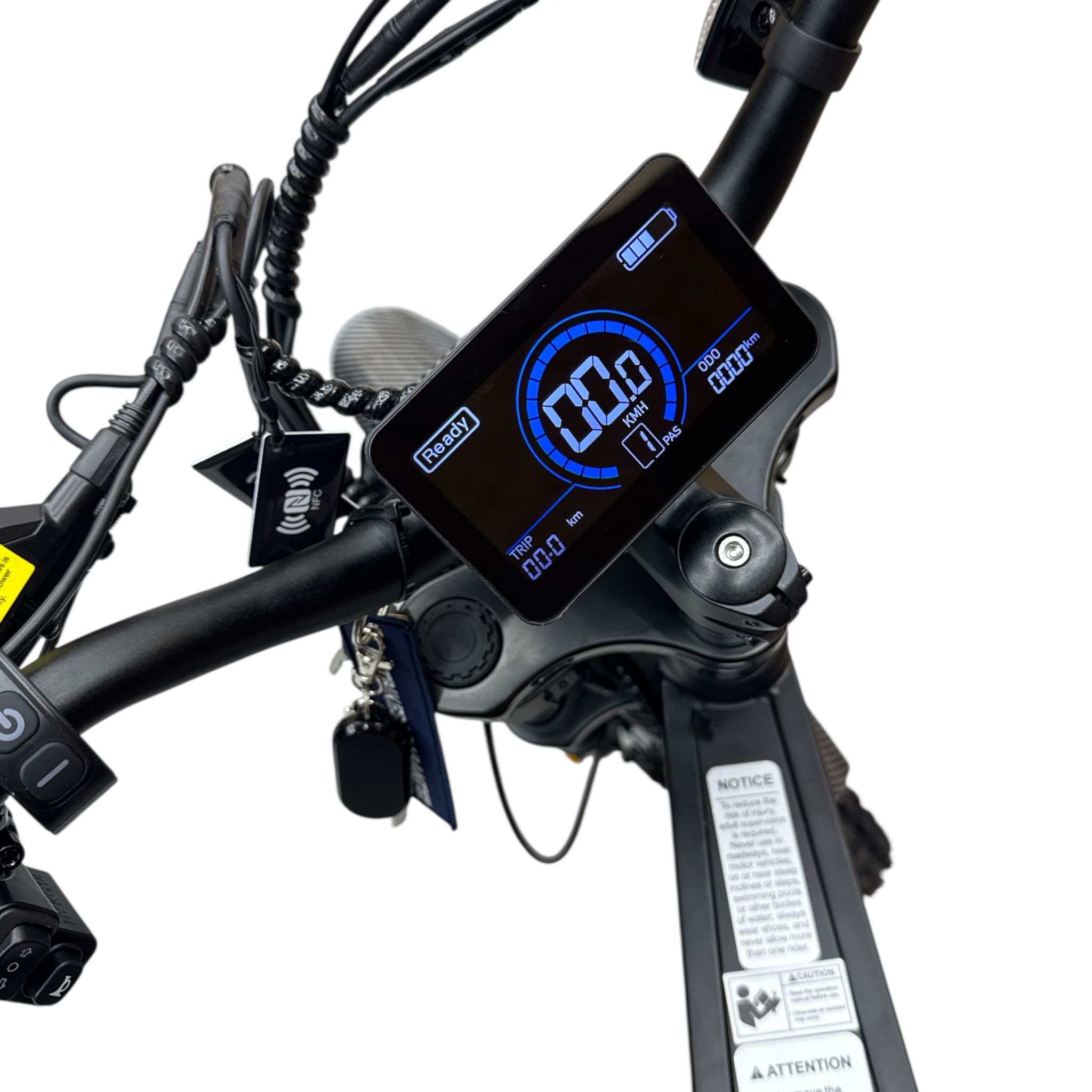 De fatbike is uitgerust met een modern LED display waarop je eenvoudig snelheid, accustatus en rijmodus kunt aflezen. Dankzij de NFC chip kun je de fiets veilig starten met een NFC sleutel of kaart, wat extra bescherming biedt tegen ongewenst gebruik.